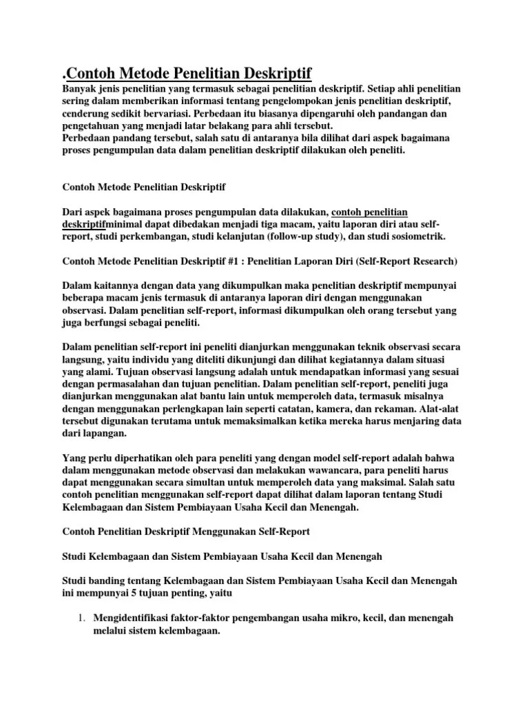 Contoh metode penelitian deskriptif. Menurut sugiyono penelitian deskriptif adalah penelitian dengan metode untuk menggambarkan suatu hasil penelitian. Dari level of expalanation dapat dibedakan menjadi penelitian deskriptif komparatif dan asiosiatif. Teknik ini berhubungan erat dengan berbagai jenis metode yang ada dalam riset itu sendiri. Definisi sederhana yang sering disampaikan adalah metode penelitian yang proses pengumpulan datanya memungkinkan peneliti untuk menghasilkan deskripsi tentang fenomena sosial yang diteliti melalui data deskriptif peneliti mampu mengidentifikasi mengapa apa dan bagaimana fenomena sosial terjadi.
