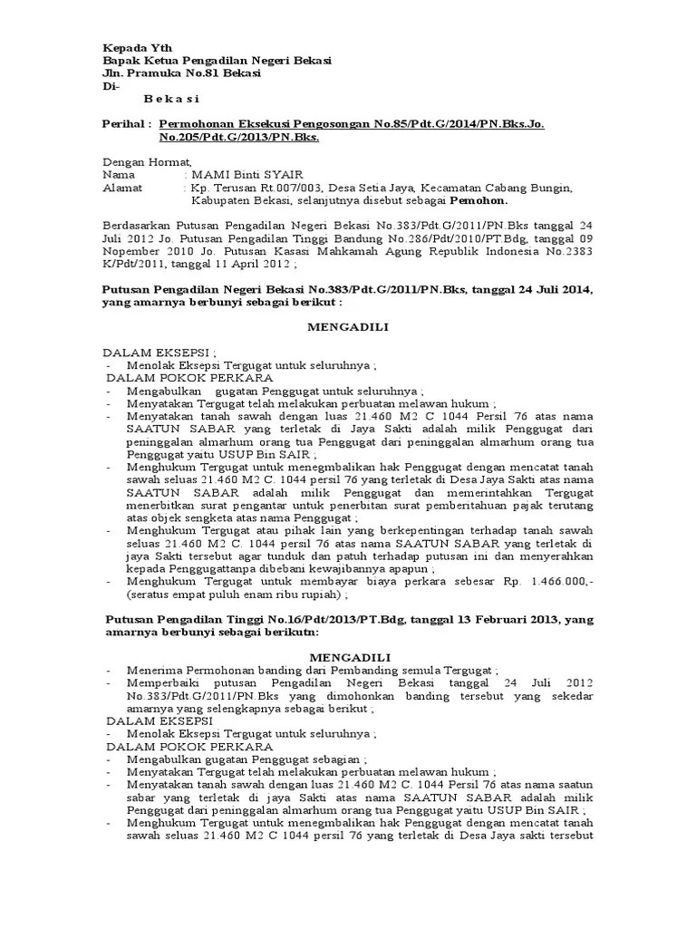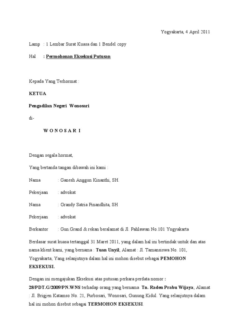 Contoh surat kuasa eksekusi putusan. Makasar 26 juni 1975 29 tahun. Contoh permohonan eksekusi atas putusan perkara perdata kota tangerang selatan 17 juli 2014. Adapun amar putusan pengadilan adalah sebagai berikut. Kepada yang terhormat.