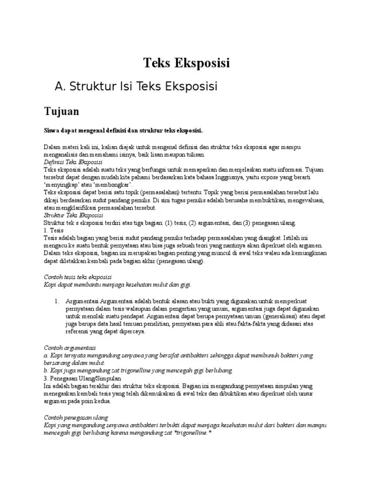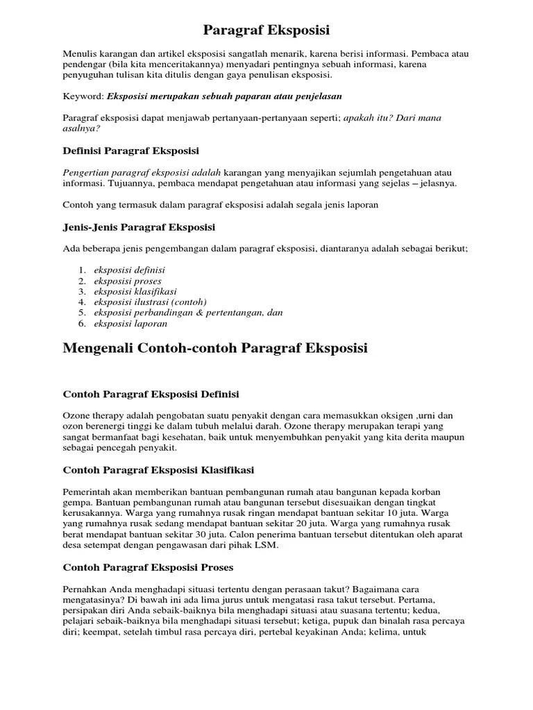 Contoh teks eksposisi teks eksposisi merupakan suatu tulisan yang berisi fakta atau informasi berbentuk pengembangan paragraf yang berupaya untuk menerangkan suatu keadaan tertentu sehingga orang yang membacanya mendapatkan pengetahuan dari apa yang diuraikan oleh penulis.