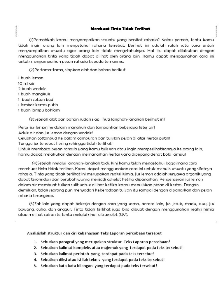 Demikianlah pembahasan mengenai contoh teks cerita sejarah pengertian struktur ciri kaidah unsur jenis dan cara semoga dengan adanya ulasan tersebut dapat menambah wawasan dan pengetahuan anda semua terima kasih banyak atas kunjungannya. Masak susu segar beserta gula pasir ke dalam panci ke dalam air yang mendidih sambil di aduk aduk. Ciri ciri teks laporan percobaan dalam memahami suatu materi yang ada di sekolah pasti kalian pernah melakukan percobaan. Setelah selesai melakukan percobaan kalian tentu ditugaskan untuk menuliskan hasilnya ke dalam teks laporan percobaan.