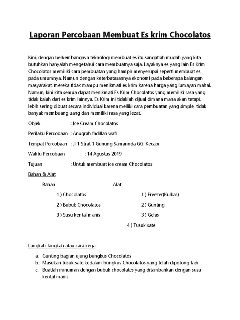 Contoh teks laporan percobaan ice cream. Ice cream terbagi menjadi dua macam diantaranya yaitu standard ice cream dan special ice cream. Standard ice cream of various flavor. Mousse yaitu whipping cream yang dibekukan dan diperkaya dengan flavor. Cara membuat slime ini cukup mudah sekali serta tidak memakan banyak biaya.