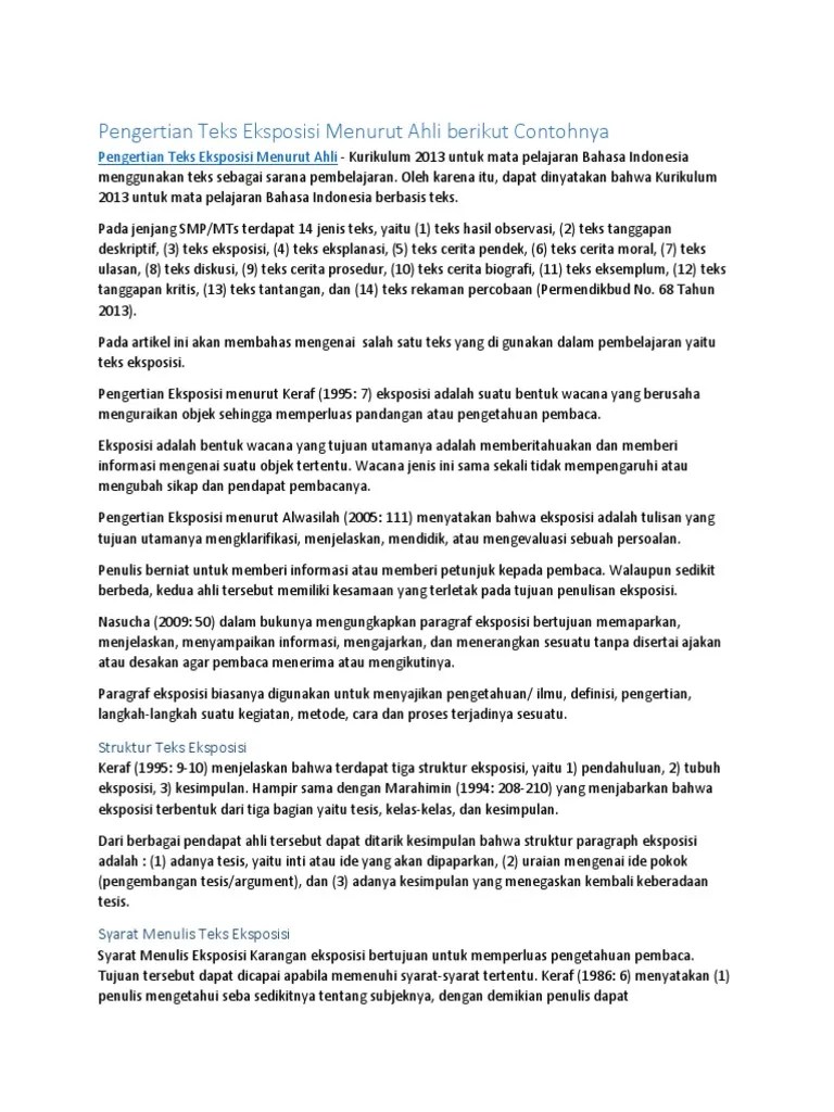 Jelaskan pengertian teks eksposisi. Bukan hanya itu saja apabila kita membahas suatu informasi kepada teman teman juga termasuk kedalam. Paragraf eksposisi ini bersifat ilmiah atau dapat dikatakan non fiksi. Contoh teks eksposisi singkat pengertian teks eksposisi adalah sebuah teks atau paragraf yang di dalamnya berisi sejumlah informasi dan pengetahuan dengan gaya penulisan sigkat padat dan akurat. Teks eksposisi adalah sebuah paragraf atau karangan yang didalamnya terkandung informasi informasi serta juga pengetahuan yang ditulis dengan tujuan untuk dapat memberikan atau menjelaskan pengertian dengan penulisannya yang singkat akurat serta padat.