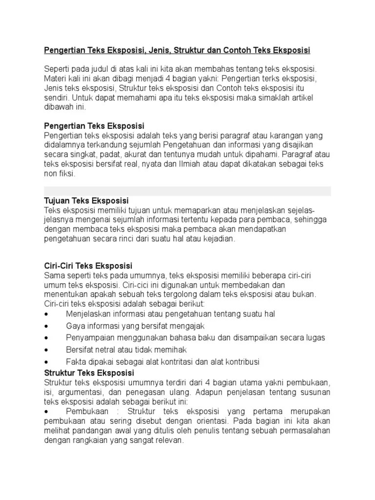Paragraf eksposisi adalah sebuah paragraf yang mengadung penjelasan explanation informasi information atau juga pengetahuan yang berkaitan pada topik yang. Tidak seperti teks negosiasi yang berisi dua argumentasi. Batasan pengertian sesuatu dengan menfokuskan pada karakteristik sesuatu itu. Jenis ini berisikan langkah langkah atau juga cara untuk melakukan sesuatu hal dari awal sampai akhir.