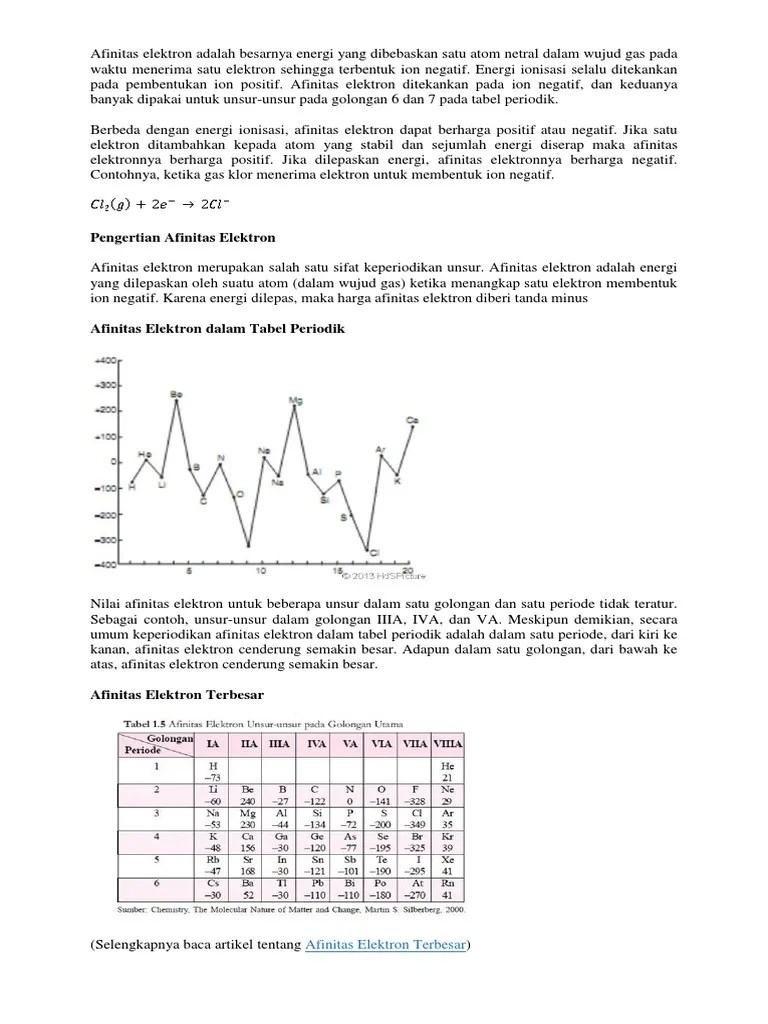 Kecenderungan sifat lain dalam sistem periodik 1. Afinitas elektron itu ialah setara ion negatif dan penggunaannya hampir juga selalu terbatas pada unsur unsur dalam kelompok 16 serta 17 dari tabel periodik. Maka unsur yang mempunyai afinitas elektron terbesar adalah klor dengan nilai afinitas 349 0. Pertama afinitas elektron merupakan energi yang dilepaskan pada saat 1 mol atom gas masing masing memperoleh elektron untuk membentuk 1 mol ion gas 1.
