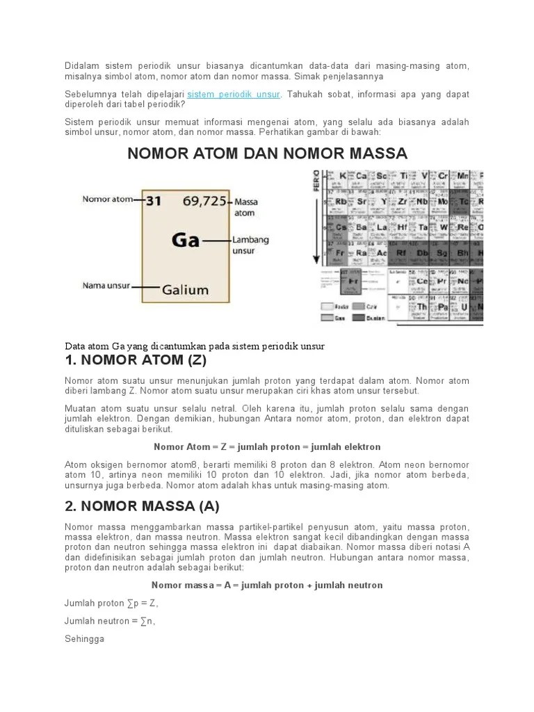 Karena massa elektron sangatlah kecil dan massa neutron hampir sama dengan massa proton maka massa atom biasanya dinyatakan dengan jumlah proton dan neutron pada inti atom pada isotop yang memiliki kelimpahan terbanyak di alam. Lambang unsur nomor atom massa atom atau isotop yang paling stabil serta golongan dan nomor periode dalam tabel periodik. Pada abad ke 19 para ahli kimia mencoba menyusun tabel periodik berdasarkan nomor massa unsur. Unsur unsur tersebut di susun berdasarkan nomor atom yaitu jumlah proton dalam inti atom konfigurasi elektron dan keberulangan sifat kimia.