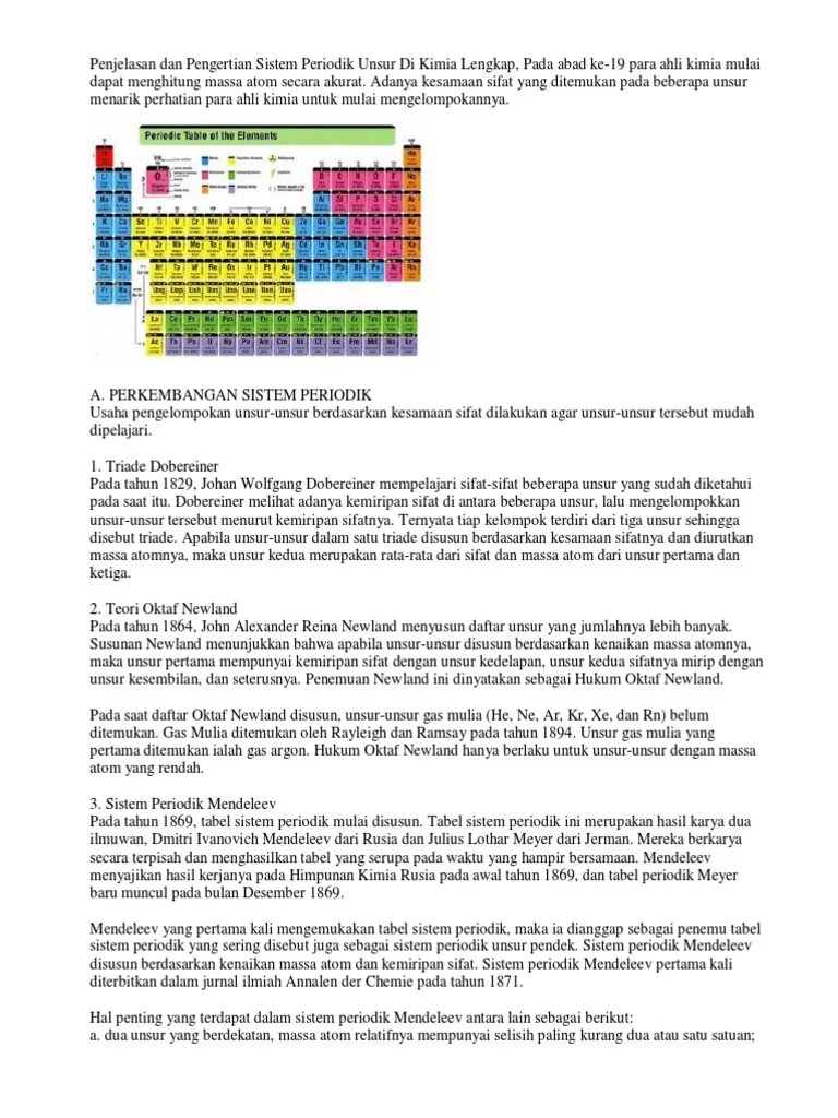 Sistem periodik adalah suatu tabel berisi identitas unsur unsur yang dikemas secara berkala dalam bentuk periode dan golongan berdasarkan kemiripan sifat sifat unsurnya. Pelajari lebih lanjut tentang teori dobereiner t eori dobereiner merupakan salah satu teori penyusun tabel periodik unsur yang ditemukan oleh wolfgang dobereiner pada tahun 1817. Sofyan sejarah perkembangan tabel periodik unsur kimia.
