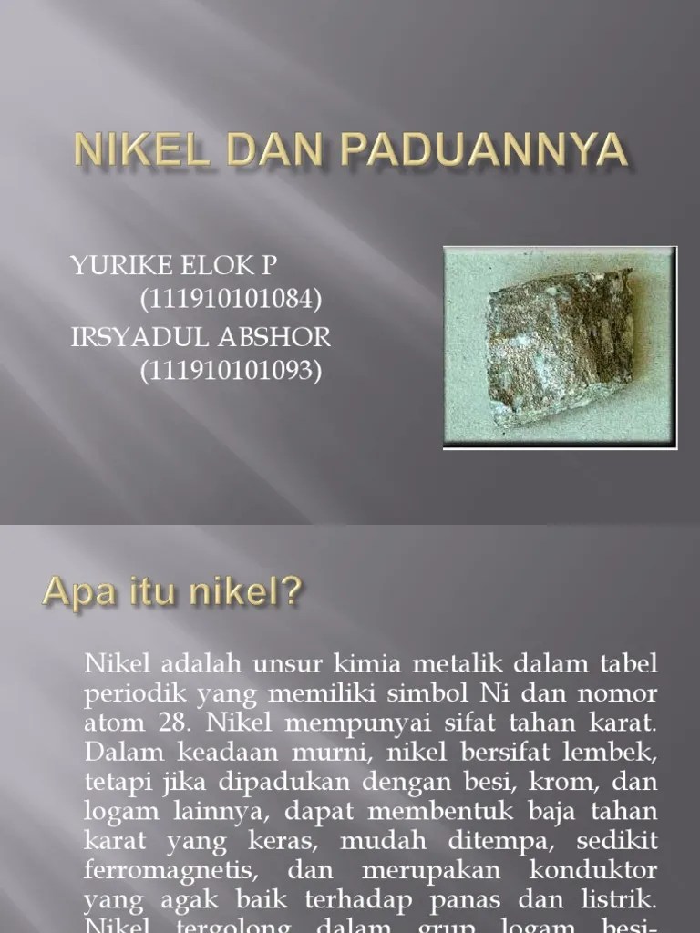 Tabel periodik nikel. Nikel adalah unsur kimia metalik dalam tabel periodik yang memiliki simbol ni dan nomor atom 28. Nikel nikel adalah unsur kimia metalik dalam tabel periodik yang memiliki simbol ni dan nomor atom 28 nikel mempunyai sifat tahan karat. Nikel mempunyai sifat tahan karat. Nikel ni deposit nikel ditemukan di kaledonia baru australia cuba indonesia.