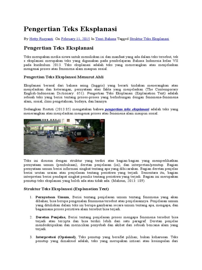 Teks eksplanasi adalah teks yang menerangkan suatu yang bersifat. Di dalam teks eksplanasi pula dijelaskan bagaimana sebuah peristiwa muncul akibat peristiwa lain sebelumnya pun peristiwa tersebut menimbulkan peristiwa lain setelahnya. Teks eksplanasi ilmiah adalah teks yang menerangkan suatu proses yang bersifat. 651 pengertian teks eksplanasi explanation text adalah sebuah teks yang berisi tentang proses proses yang berhubungan dengan fenomena fenomena alam sosial ilmu pengetahuan budaya dan lainnya. Sebuah peristiwa baik peristiwa alam maupun sosial yang terjadi disekitar kita selalu memiliki hubungan sebab akibat serta juga proses.