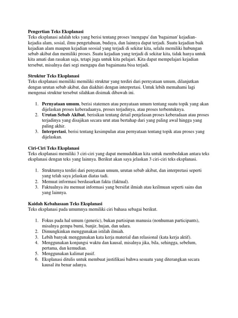 Teks eksplanasi adalah teks yang menjelaskan tentang proses terjadinya atau terbentuknya sesuatu. Teks eksplanasi adalah teks yang menjelaskan tentang proses terjadinya atau pun terbentuknya suatu fenomena alam sosial dan budaya. Dengan kalimat lain teks merupakan teks yang berisi tentang proses mengapa dan bagaimana suatu peristiwa alam sosial budaya dan ilmu pengetahuan bisa terjadi. Sebenarnya apa yang dimaksud dengan teks eksplanasi explanatory text pengertian teks eksplanasi adalah teks yang menjelaskan tentang proses atau tahapan mengapa dan bagaimana terjadinya suatu fenomena atau peristiwa yang berkaitan dengan alam sosial ilmiah dan budaya. Teks eksplanasi menjelaskan mengapa dan bagaimana sebuah peristiwa terjadi.