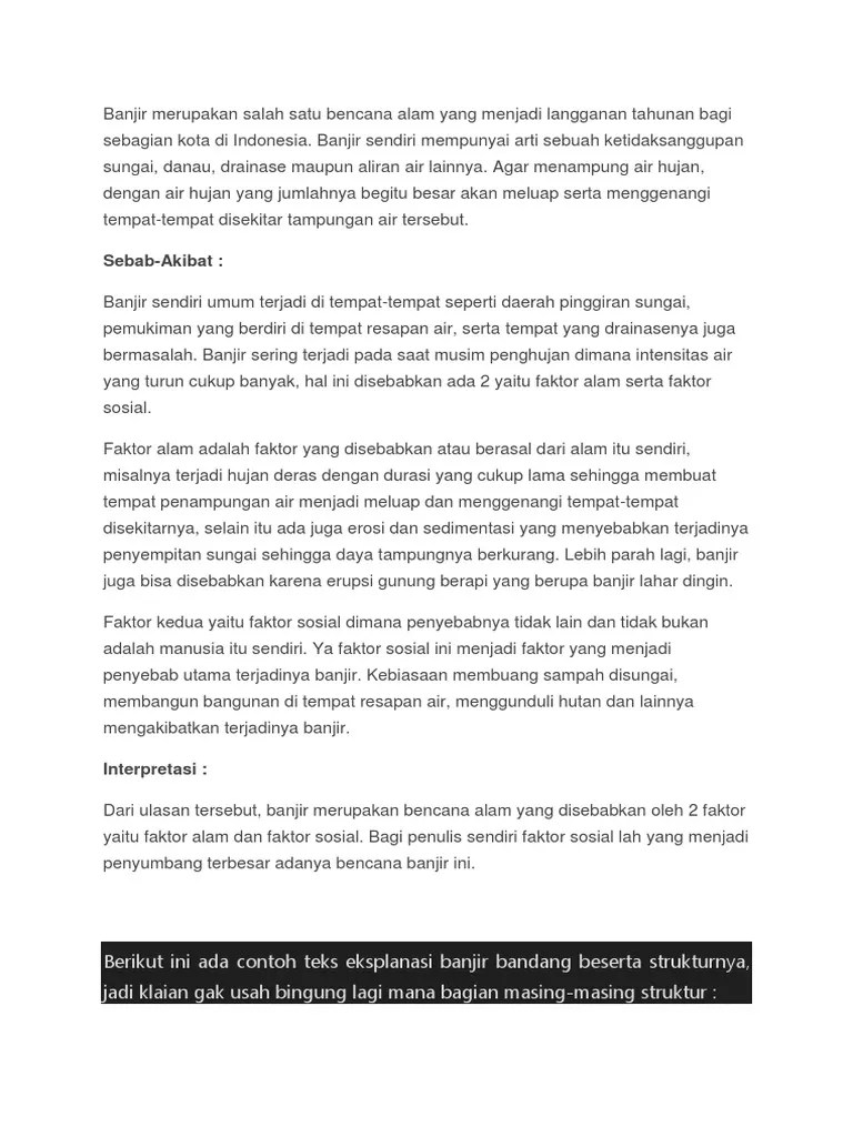 Oleh dosenpendidikan diposting pada 29 05 2020. Pernyataan umum pembuka disini dijelasin mengenai latar belakang terjadinya banjir bandang. Setelah menginterpretasi teks eksplanasi dari sisi struktur teks isi dan kebahasaan pada tugas sebelum ini tugas berikutnya adalah membuat atau memproduksi teks eksplanasi tentang peristiwa sosial dengan tema banjir bandang. Contoh teks eksplanasi fenomena alam bencana banjir berikutnya akan disajikan contoh teks eksplanasi singkat berupa fenomena alam atau bencana alam banjir tepatnya banjir bandang dalam pola penyusunan kausalitas atau sebab akibat.