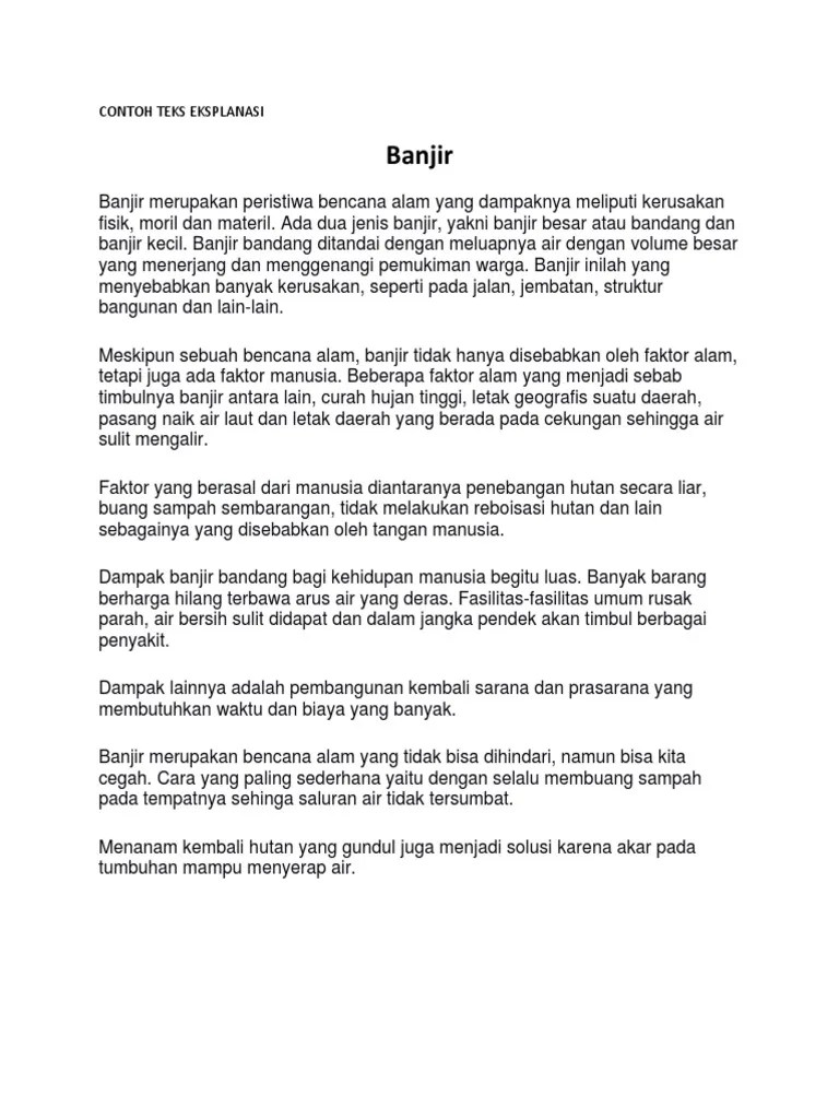 Teks eksplanasi banjir singkat. Eksplanasi berasal dari bahasa asing inggris yang berarti tindakan menerangkan atau menjelaskan dan keterangan pernyataan atau fakta yang menjelaskan the contemporary english indonesian dictionary. Contoh teks eksplanasi teks eksplanasi adalah media teks yang berisi proses tentang kenapa dan bagaimana suatu peristiwa bisa terjadi. 651 pengertian teks eksplanasi explanation text adalah sebuah teks yang berisi tentang proses proses yang berhubungan dengan fenomena fenomena alam sosial ilmu pengetahuan budaya dan lainnya. Contoh teks eksplanasi fenomena alam bencana banjir berikutnya akan disajikan contoh teks eksplanasi singkat berupa fenomena alam atau bencana alam banjir tepatnya banjir bandang dalam pola penyusunan kausalitas atau sebab akibat.