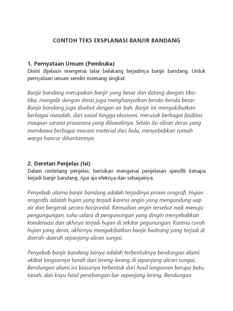 Berikut ini terdapat beberapa contoh teks eksplanasi antara lain sebagai berikut. Eksplanasi berasal dari bahasa asing inggris yang berarti tindakan menerangkan atau menjelaskan dan keterangan pernyataan atau fakta yang menjelaskan the contemporary english indonesian dictionary. Kalimat tanya semua informasi yang disampaikan di dalam teks ialah berdasarkan fakta faktual tanpa adanya tambahan opini dari penulis. Ada banyak fenomena sosial ekonomi dan kejadian di alam yang bersifat kompleks.