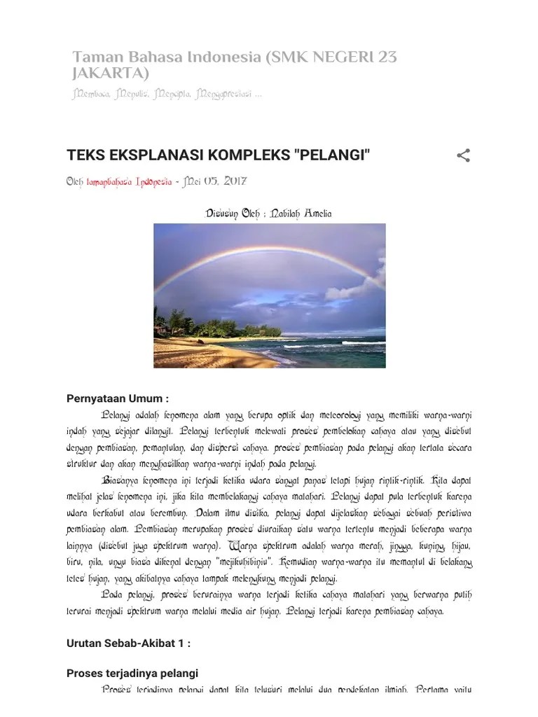 Yang sudah menjadi problem sejak lama di masyarakat. Pelangi adalah salah satu fenomena alam yang sangat indah. Contoh teks eksplanasi dilihat dari kata nya seharusnya anda sudah paham apa itu teks eksplanasi. Pernyataan umum pembuka pelangi bahasa inggrisnya rainbow merupakan suatu peristiwa optik atau meterologi berwujud cahaya yang bermacam macam warna paralel satu dengan yang lainnya di langit atau juga media yang lain.