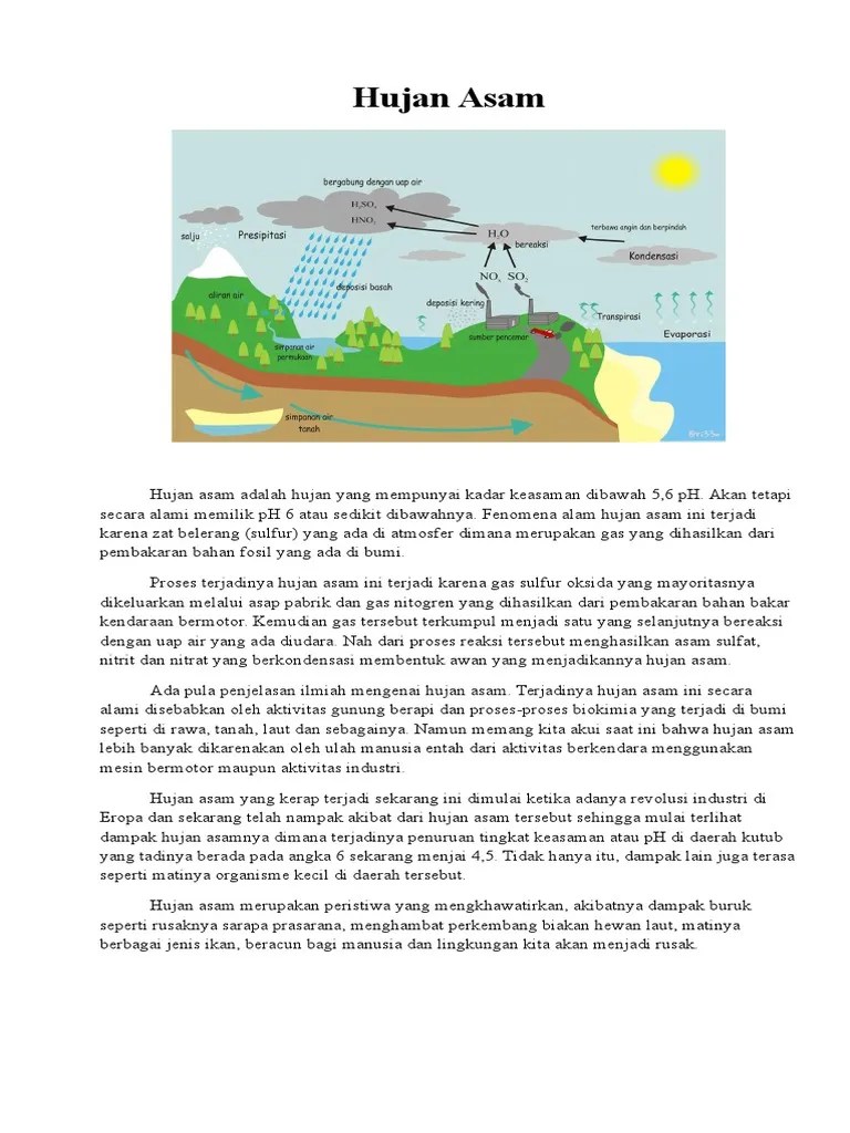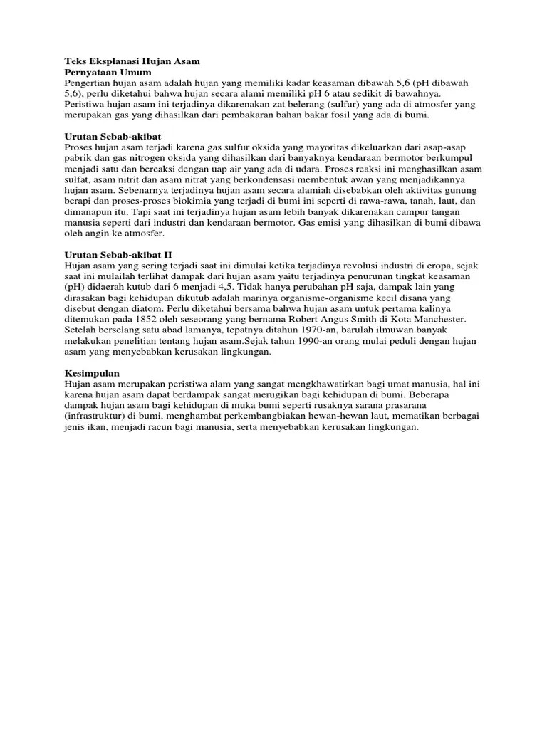 Teks eksplanasi hujan asam. Kaidah kebahasaan teks eksplanasi. Hujan asam hujan asam merupakan salah satu dampak pemanasan global yang terjadinya dibumi ini. Berbeda dengan jenis hujan pada umumnya hujan asam menurunkan air yang memiliki derajat kemasaman tinggi yaitu di bawah 5 6. 1 hujan adalah salah satu fenomena alam yang sering terjadi di sekitar daerah industri dan daerah daerah sekitar gunung berapi.