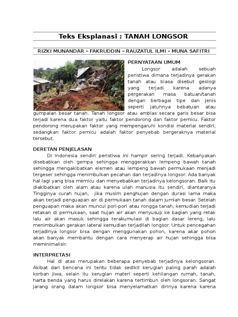 Penyebab tanah longsor ini ada 2 macam yaitu. Berikut contoh teks eksplanasi tanah longsor beserta strukturnya. Contoh teks eksplanasi tanah longsor. Berpindah ke teks eksplanasi mengenai peristiwa alam berikutnya yaitu tanah longsor.