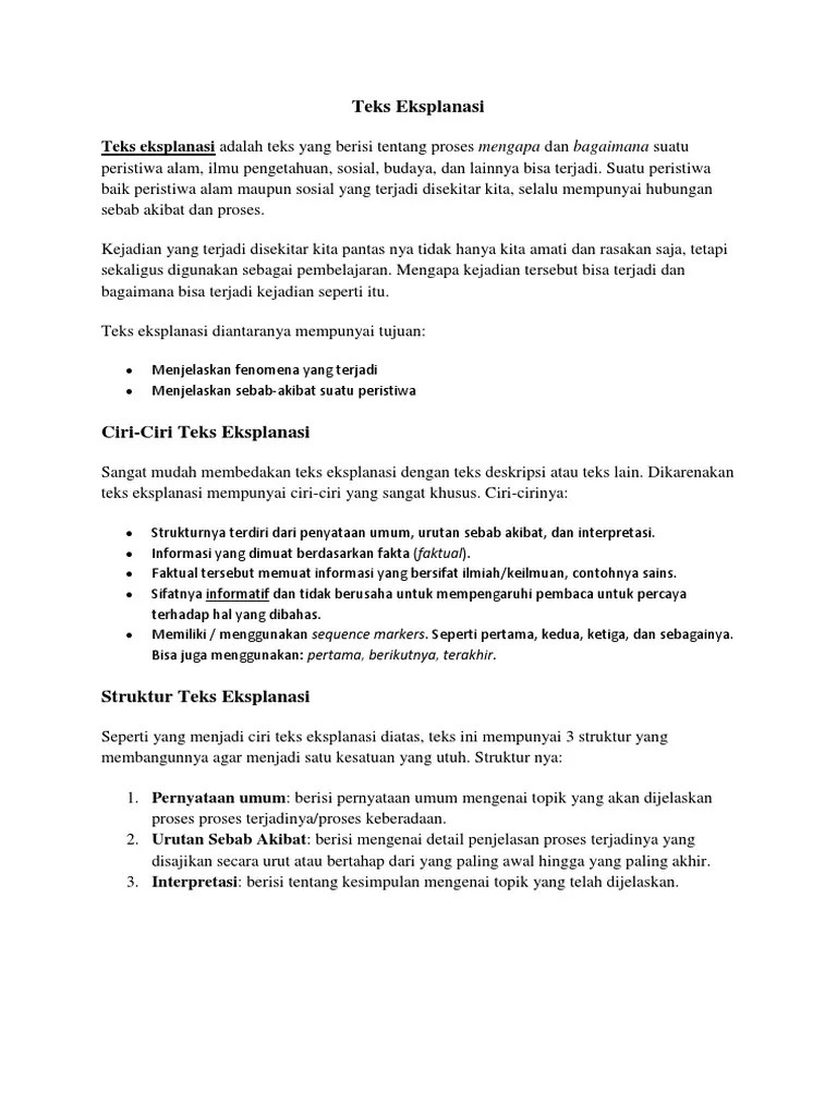 Eksplanasi berasal dari bahasa asing inggris yang berarti tindakan menerangkan atau menjelaskan dan keterangan pernyataan atau fakta yang menjelaskan the contemporary english indonesian dictionary. Teks eksplanasi merupakan teks yang berisi tentang suatu proses mengapa dan bagaimana. Beberapa bencana alam yang kami singgung diatas akan kami jelaskan secara terperinci dalam bentuk contoh teks eksplanasi singkat beserta strukturnya. Teks eksplanasi menyampaikan penjelasan tentang proses terciptanya sesuatu secara natural atau alami.