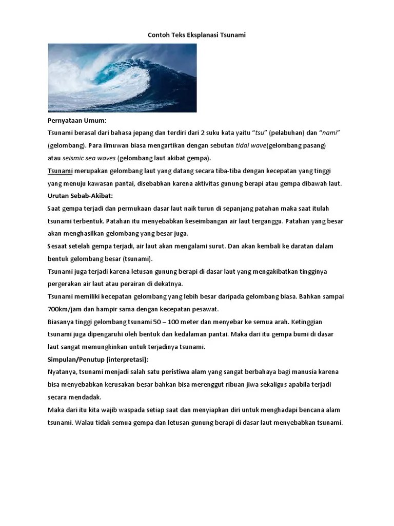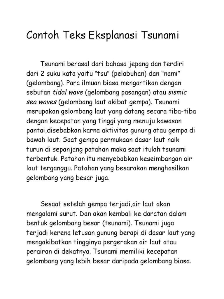 Teks eksplanasi tsunami. Perubahan permukaan laut tersebut bisa disebabkan oleh gempa bumi yang berpusat di bawah laut. Pada sebuah teks eksplanasi peristiwa yang timbul karena adanya peristiwa lain. Bencana yang besar ini juga sering menjadi judul untuk contoh teks eksplanasi tsunami. Tsunami tsu pelabuhan nami gelombang secara harafiah berarti ombak besar di pelabuhan adalah perpindahan badan air yang disebabkan oleh perubahan permukaan laut secara vertikal dengan tiba tiba.