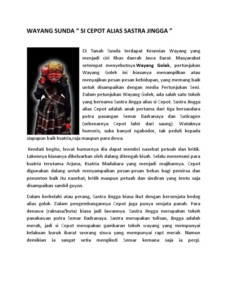 Wayang adalah seni pertunjukkan asli indonesia yang berkembang pesat di pulau jawa dan bali. 20 contoh teks eksposisi beserta strukturnya. Wayang kulit sakmeniko biasane dinggo para wali ngaturaken islam marang masyarakat jawa. Selain wayang golek sunda wayang yang terbuat dari kayu adalah wayang menak atau sering juga disebut wayang golek menak karena cirinya mirip dengan wayang golek.
