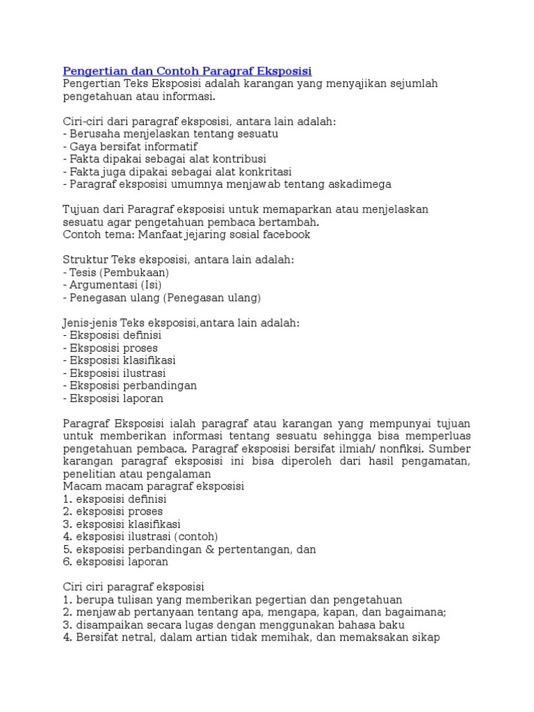 Paragraf eksposisi adalah sebuah paragraf yang mengadung penjelasan explanation informasi information atau juga pengetahuan yang berkaitan pada topik yang. Teks eksposisi ciri fungsi struktur kaidah contoh untuk pembahasan kali ini kami akan memberikan ulasan mengenai teks eksposisi yang dimana dalam hal ini meliputi pengertian ciri fungsi struktur kaidah dan contoh nah agar lebih dapat memahami dan mengerti simak ulasan selengkapnya dibawah ini. Contoh teks eksposisi tentang klasifikasi. Berdasarkan jenisnya limbah tersebut dibagi menjadi limbah organik limbah anorganik dan limbah kimia.