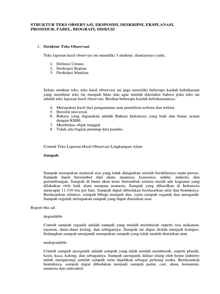 Sampah refuse adalah sebagian dari sesuatu yang tidak dipakai tidak disenangi atau sesuatu yang harus dibuang yang umumnya berasal dari kegiatan yang dilakukan oleh manusia termasuk kegiatan industri tetapi bukan biologis karena human waste tidak termasuk di dalamnya dan umumnya bersifat padat azwar 1990. Bedanya teks eksposisi ini akan membahas dan menyampaikan informasi seputar lingkungan.