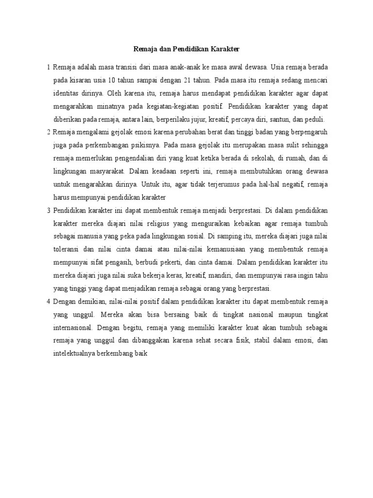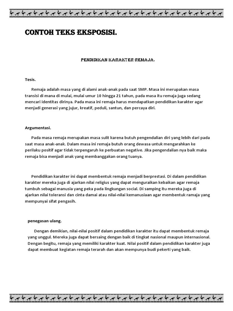 Umumnya pendidikan ini tidak bisa diajarkan hanya dengan memberikan materi saja. Remaja adalah masa yang dialami oleh anak anak pada saat smp. Pendidikan co id kali ini kita akan membahas mengenai teks eksposisi untuk penjelasan selengkapnya akan dipaparkan juga mengenai tujuan fungsi manfaat jenis struktur ciri kaidah dan cara membuat teks eksposisi. Pendidikan karakter merupakan pendidikan yang berperan untuk menanamkan nilai moral dan sosial kepada peserta didik.