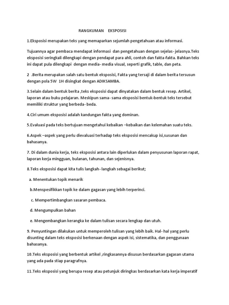 Rangkuman teks eksposisi bahasa indonesia dalam kehidupan sehari hari kita menjumpai banyak sekali tulisan baik yang berisi informasi pengetahuan maupun sebuah tips cara pemakaian sesuatu. Penggunaan bentuk pasif dilakukan agar ungkapannya lebih formal dan kuat. Sinonim digunakan untuk menghindari pengulangan kata. Rangkuman bahasa indonesia tentang teks eksposisi ð teks eksposisi adalah teks yang memaparkan sejumlah informasi atau pengetahuan.